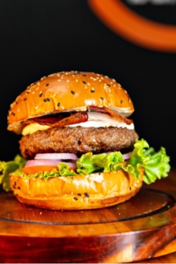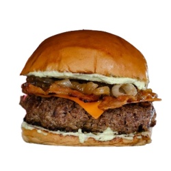 BURGER 150g, QUEIJO CHEDDAR, FAROFA DE BACON, CEBOLA CARAMELIZADA, ALFACE, MAIONESE DA CASA NO PÃO BRIOCHE.