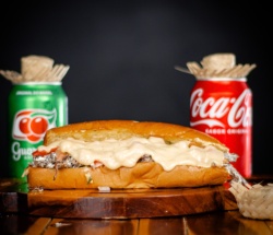 PÃO FRANCÊS OU BRIOCHE, PICANHA EM TIRAS, QUEIJO MUÇARELA E PASTA DE ALHO.