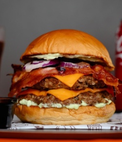PÃO BRIOCHE, 2 HAMBURGUERES, FRANGO, BACON, CALABRESA, 2 OVOS, MUSSARELA, PRESUNTO E VERDURAS.