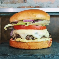 BURGER 150g, QUEIJO CHEDDAR, OVO, FATIAS DE BACON, ALFACE, CEBOLA CARAMELISADA, MAIONESE DA CASA NO PÃO BRIOCHE.