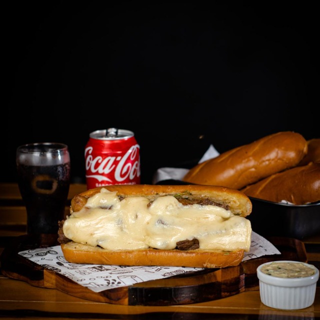 PÃO FRANCÊS OU BRIOCHE, PICANHA EM TIRAS, QUEIJO MUÇARELA E PASTA DE ALHO.