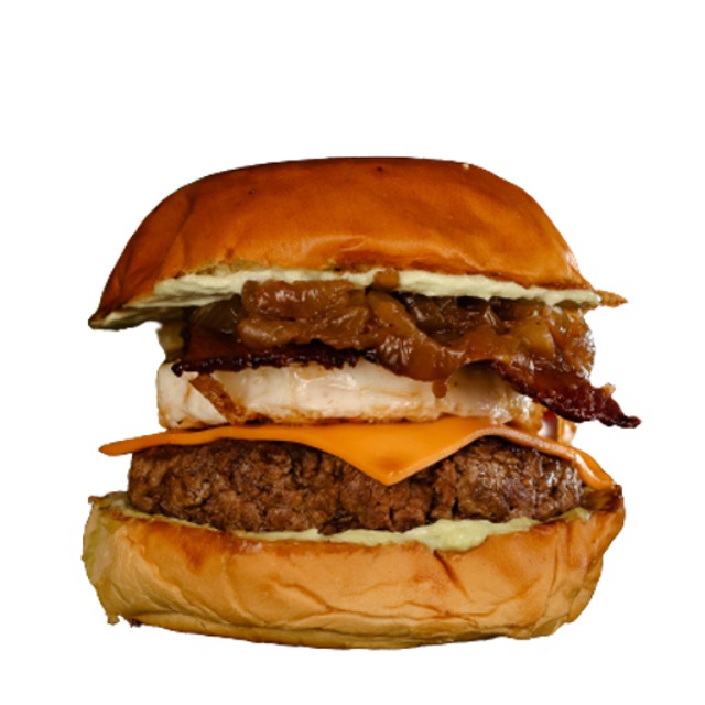 BURGER 150g, QUEIJO CHEDDAR, OVO, FATIAS DE BACON, ALFACE, CEBOLA CARAMELISADA, MAIONESE DA CASA NO PÃO BRIOCHE.